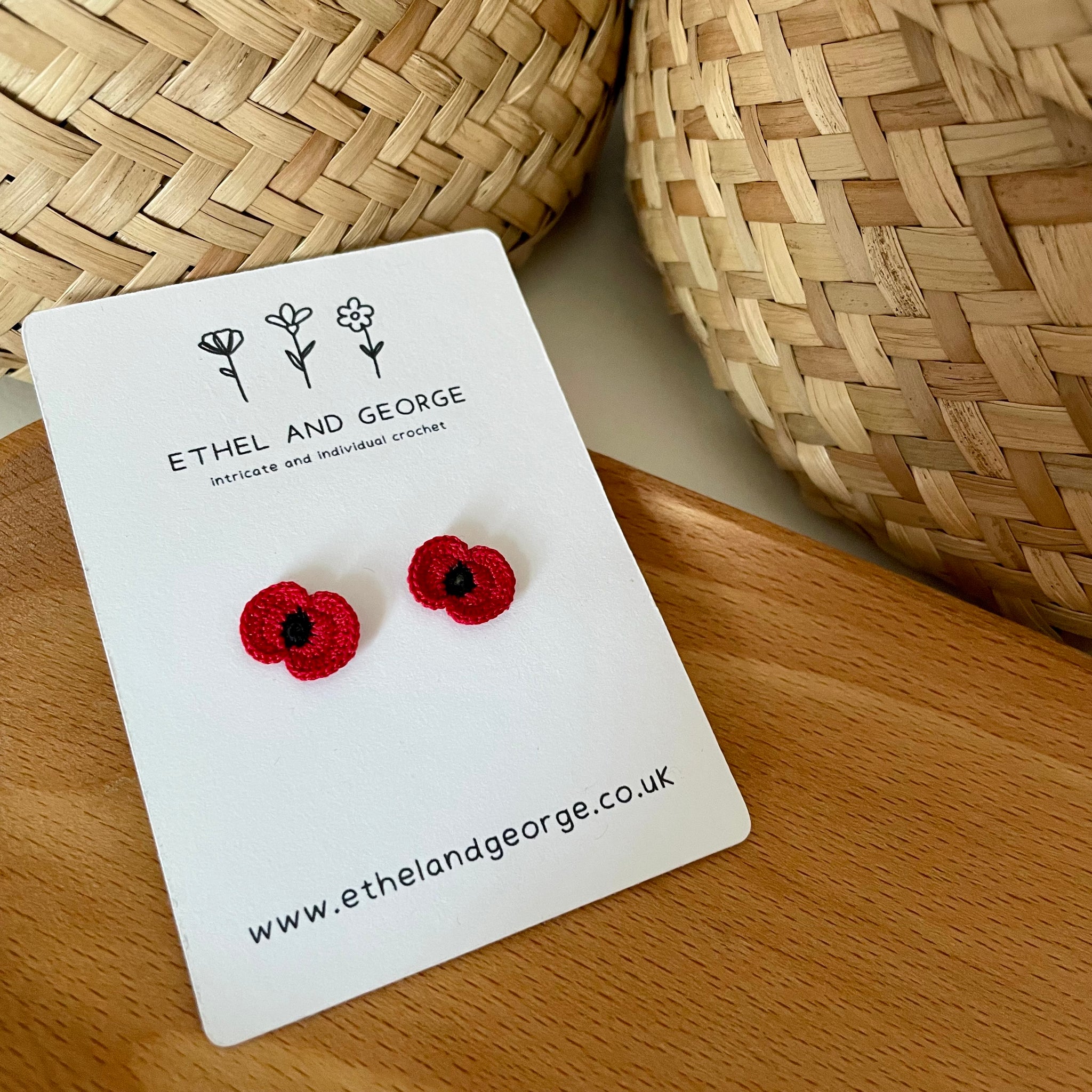 Micro-crochet Poppy stud earrings with a butterfly black. Poppy crocheted in 100% cotton, backed onto a stainless steel flat stud.