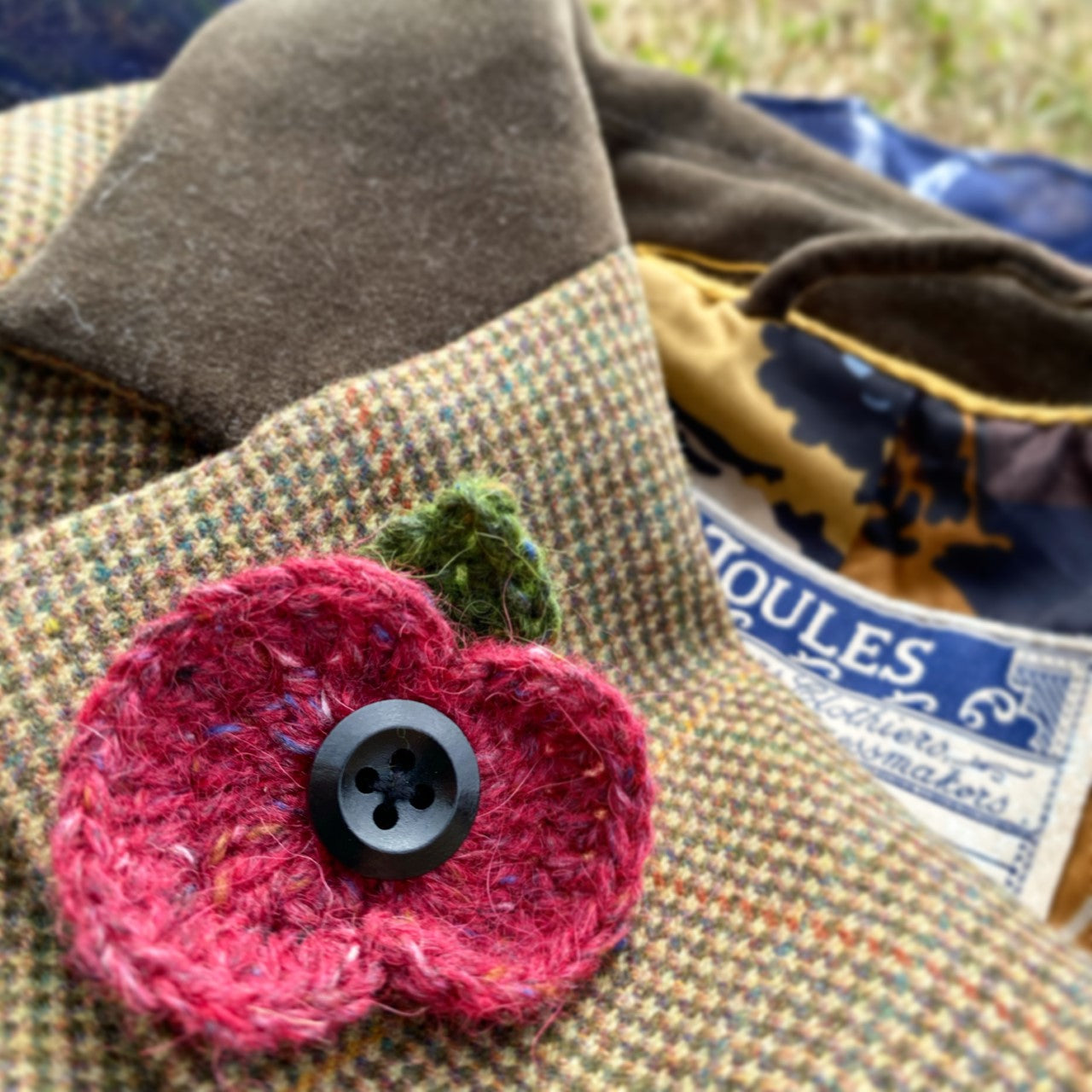 Each flower is crocheted by hand in a variety of high quality tweed wool and finished with a black button.